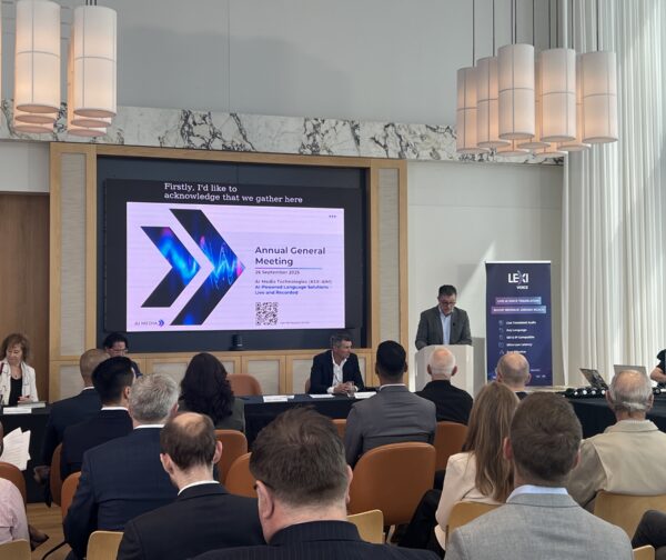 For AI-Media’s AGM, the hybrid setup included LEXI Voice, giving shareholders access to real-time translations in over 100 languages via personal headphones, allowing multilingual participants to follow the meeting seamlessly.
